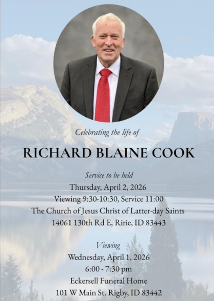 We've just learned of the passing of another classmate, Richard Cook, on 26th March 2026. It is always a sad event when a classmate leaves us. We will update the 'In Memory' page for Richard as soon as we get the obituary. But in the meantime, here are details on his funeral services in Ririe.